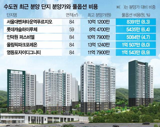 이날 1순위 청약을 접수한 서울 관악구 신림동 서울대벤처타운역푸르지오(신림3구역 재개발) 전용면적 84㎡의 최고 분양가는 10억 1200만 원으로 여기에 옵션비와 중도금 이자(6~7% 추정) 등을 더하면 11억 원을 훌쩍 넘는다. 발코니 확장(최대 2821만 원) 등 풀옵션 선택 시 추가 비용이 최대 8400만 원에 육박하기 때문이다. 현관 중문뿐 아니라 바닥 마감재, 붙박이장, 시스템 에어컨 등 지나치게 세세한 부분까지 모두 옵션에 포함시켜 ‘옵션 끼워 팔기’라는 비판이 나오고 있다. 취득세(3.3%)까지 고려하면 실제 수분양자가 부담하는 총 비용은 12억 원에 육박하게 된다.
