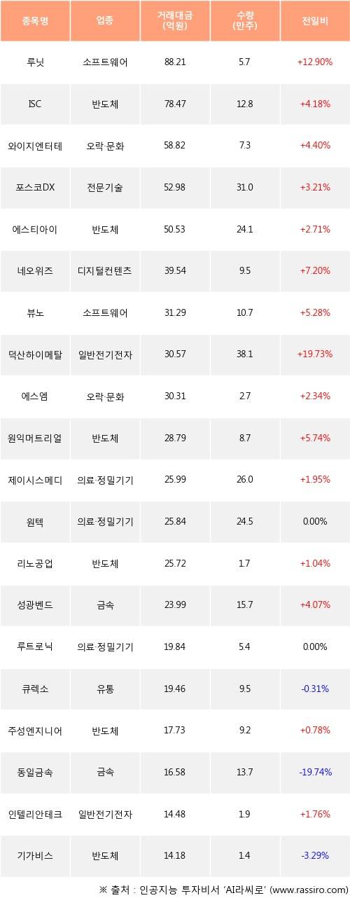 루닛, ISC, 와이지엔터테인먼트 등은 전일 대비 주가가 상승했고, 큐렉소, 동일금속, 기가비스 등은 주가가 하락했다.
