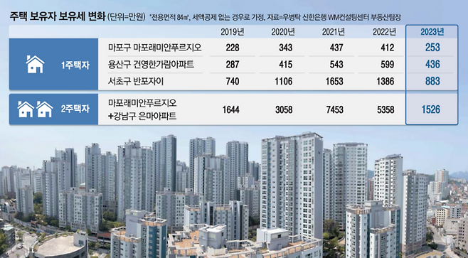 실제 우병탁 신한은행 WM컨설팅센터 부동산팀장이 모의계산한 결과, 서울 주요 아파트 단지 보유자들의 올해 보유세 부담은 2020년 수준으로 낮아진다. 용산구 이촌동 건영한가람아파트 전용면적 84㎡를 보유한 1주택자의 보유세 예상부담액은 올해 약 436만원으로, 2020년 수준(약 425만원)과 큰 차이가 없다. 작년 추정 납부액(약599만원) 대비 약 27%(166만원) 줄어든 수치다.