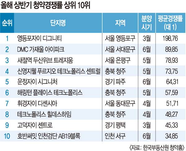 단지별로 청약 경쟁률 상위 10곳 중 4곳이 서울에 몰렸다. 영등포자이 디그니티가 198.76대 1로 전국에서 가장 치열했고 DMC 가재울 아이파크(89.85대 1)와 5월 분양한 은평구 ‘새절역 두산위브 트레지움’(78.93대 1)이 각각 전국 2, 3위 경쟁률을 남겼다. 4월에 나온 동대문구 ‘휘경자이 디센시아’는 51.71대 1로 전국 7위에 올랐다.
