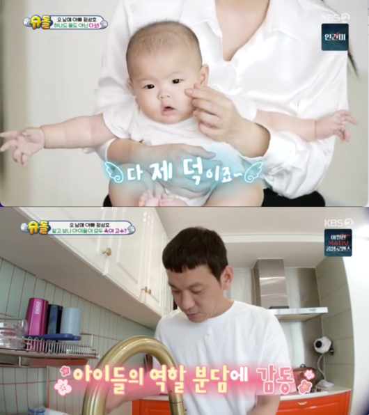 4일 오후 방송된 KBS2 ‘슈퍼맨이 돌아왔다’(이하 슈돌)에서는 개그맨 정성호가 5남매와 함께 처음 등장해 쉴 틈이 없는 다둥이 하우스의 리얼한 일상을 보여줬다.