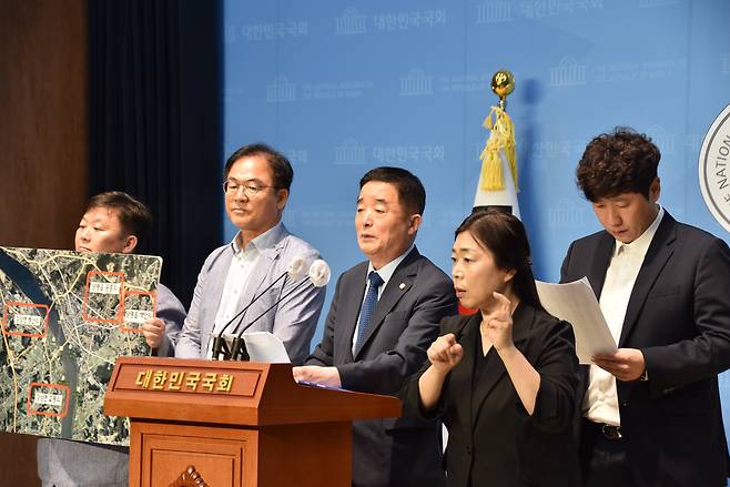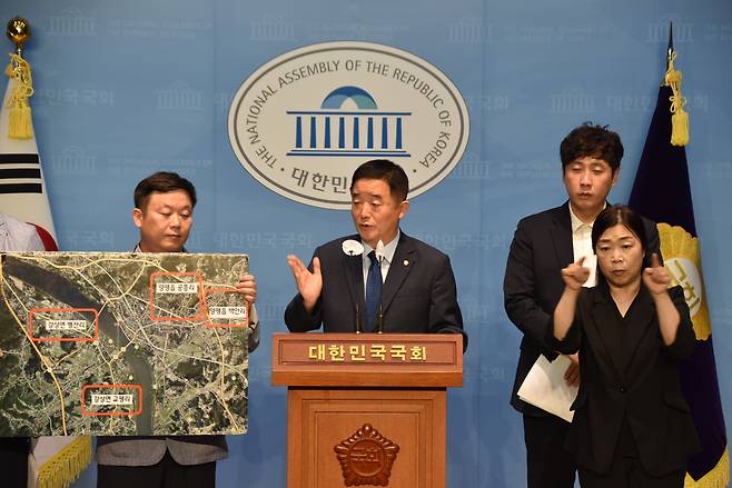 | ▲ 강득구 더불어민주당 의원(가운데), 안진걸 민생경제연구소장(사진 왼쪽) 등이 5일 국회소통관에서 윤석열 대통령 처가 특혜 의혹이 일고 있는 서울-양평 고속도로 종점 변경과 관련한 기자회견을 하고 있다. |