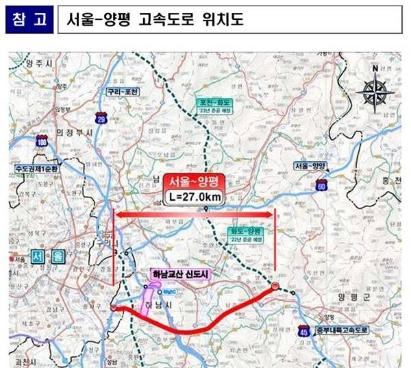 | ▲ 2021년 4월 30일 국토교통부가 발표한 '서울-양평 고속도로' 예타 통과 보도자료. 당시 사업개요에는 "경기도 하남시 감일동(오륜사거리) ~ 경기도 양평군 양서면"으로 적시돼 있다. 위 이미지는 당시 자료에 첨부된 '고속도로 위치도'. |