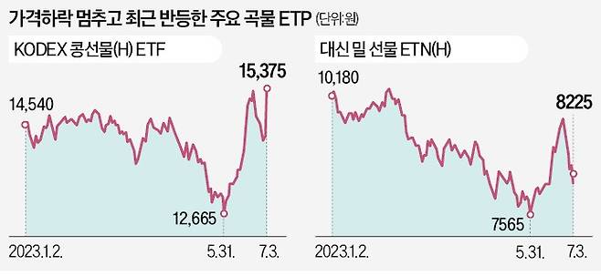 여러 곡물에 함께 투자하는 ETF들도 반등세다. ‘KODEX 3대 농산물 선물(H)’과 ‘TIGER 농산물선물Enhanced(H)’은 6월 각각 6.03%, 4.88% 올랐다. KODEX 3대 농산물 선물(H)는 콩·옥수수·밀 등에, TIGER 농산물선물Enhanced(H)는 콩·옥수수·밀·설탕 등에 투자하는 ETF다.