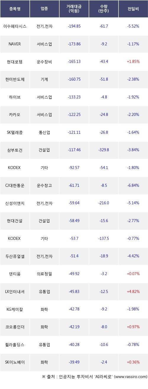 외국인 투자자의 순매도 상위 20개 종목은 이수페타시스, NAVER, 현대로템, 한미반도체, 하이브, 카카오, SK텔레콤, 삼부토건, KODEX 레버리지, CJ대한통운등이다.