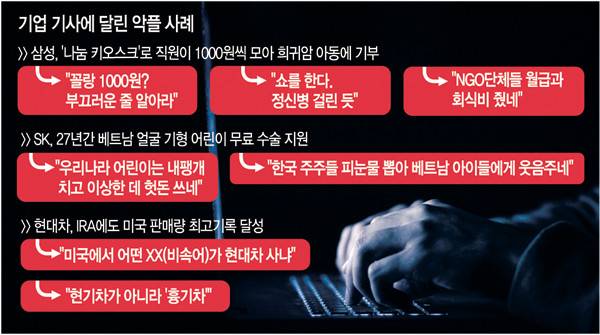 기업들이 이런 ‘악플(악성 댓글)’ 때문에 골머리를 앓고 있다. 악플은 비단 어제오늘 일은 아니지만 업계에선 해가 갈수록 문제가 심각해지고 있다고 진단한다. 악플은 훈훈한 미담 기사도 피해가지 않는다. SK가 베트남의 얼굴 기형 어린이들에게 27년 동안 무료 수술을 지원했다는 기사에는 “한국 주주들의 피눈물을 뽑아 외국 아이를 돕는다”는 식의 댓글들이 줄줄이 달렸다.