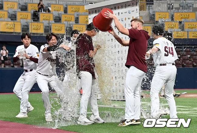임창민이 권희동과 마틴을 땅볼로 처리하고 승리를 확정짓자 미소를 지은 장재영은 동료들의 뜨거운 축하를 받았다. 투수조는 승리 인터뷰 후 시원한 물세례로 다시 한번 축하했다.