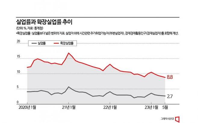 통계청이 매달 발표하는 고용동향에 따르면 실업률은 올해 1월 3.6%에서 2월 3.1%, 3월 2.9%, 4월 2.8%, 5월 2.7%로 계속 낮아지고 있다. 실업률 2.7%는 5월 기준으로 역대 최저치다. 경기 침체 우려에도 고용 지표가 좋게 나오면서 정부의 경기회복 자신감도 커졌다. 추경호 경제부총리 겸 기획재정부 장관은 지난달 국회에서 "일자리는 자신감을 가져도 된다"며 "현재 실업률이 사상 최저로 낮다"고 강조했다. 지난 4일 나온 하반기 경제정책 방향에서도 정부는 실업률 하락세가 계속 이어질 것으로 전망했다.
