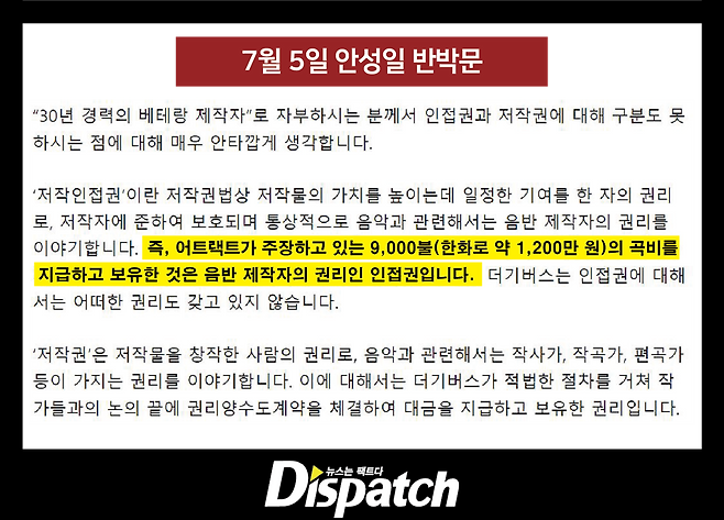 2. "어트랙트가 9,000달러(한화 1,200만 원)를 지급하고 보유한 것은 음반 제작자의 권리인 인접권입니다." (안성일)