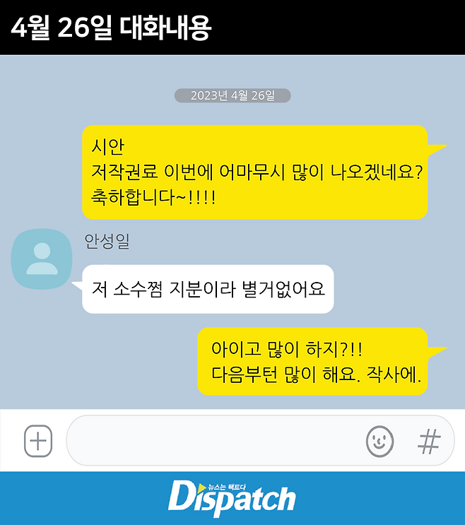 37. '디스패치'가 문제를 제기하자, 안성일이 (영어를 써가며) 급히 반박했습니다.