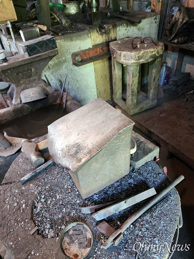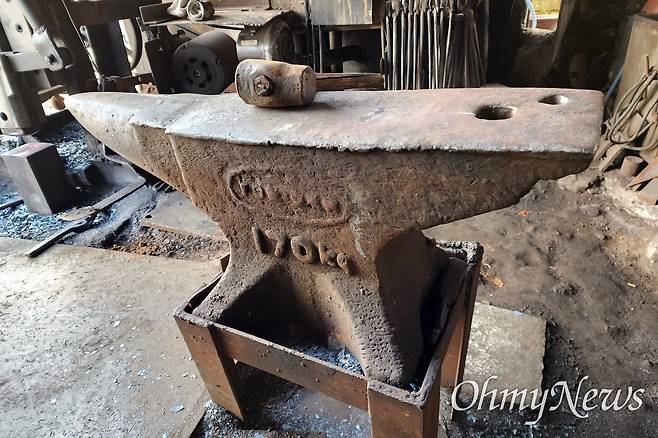 | ▲ 송종화 장인의 <인일철공소>에 놓여 있는 모루. 요즘 대부분의 우리나라 대장간에서 쓰는 이런 형태의 모루는 양모루이다. 모루 위에 망치를 올려놓았다. 2022년 11월 1일. |