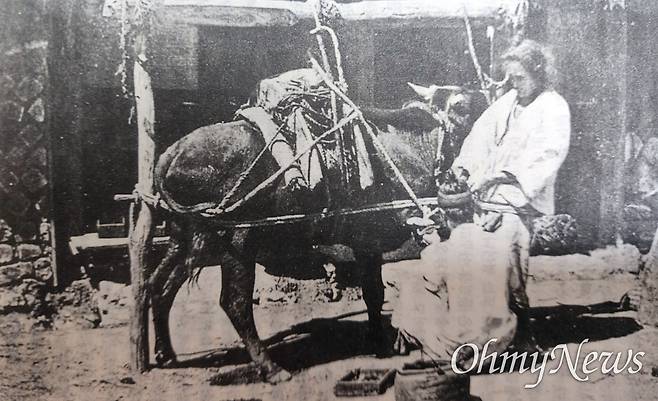 | ▲ 19세기 말 한국에 와 있던 미국인 헐버트(Homer B. Hulbert, 1863~1949) 박사의 『대한제국멸망사(The Passing of Korea)』에 실린 소 편자 박는 장면 사진. 편자 박는 장인 왼쪽에 놓인 공구 통에는 편자와 대갈, 대갈마치 같은 게 들어있었을 테다. |