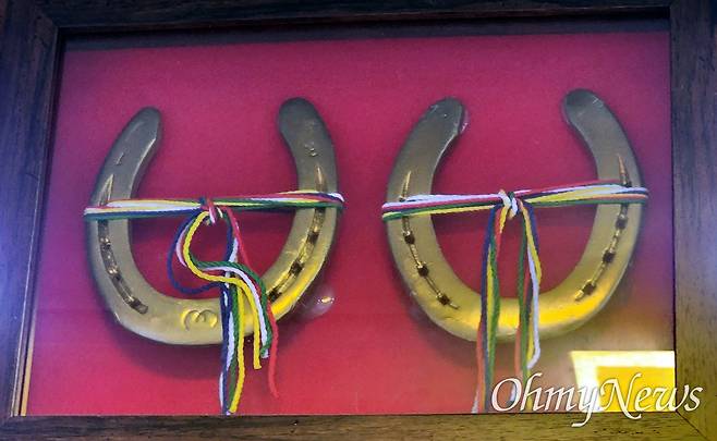 | ▲ 한 가게의 입구 위에 돈을 많이 벌게 해달라는 뜻으로 걸어 놓은 황금색 편자 장식. 액자에 넣은 모습. |