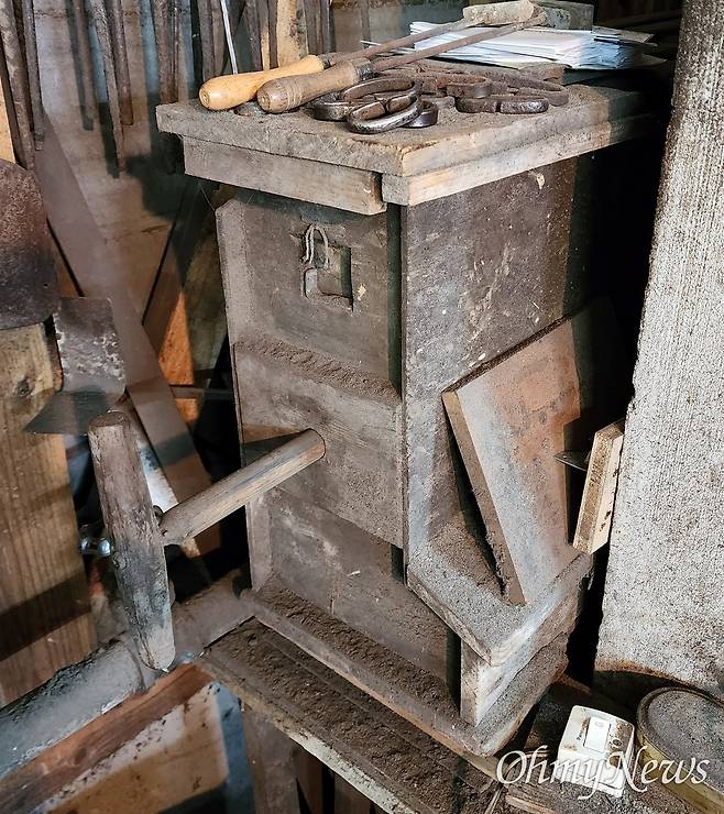 | ▲ 일본 다네가시마 우메키 쇼지 씨의 대장간에 있는 손풀무. 우리나라 대장간에서 예전에 쓰던 손풀무도 저런 모양이었다. 우메키 쇼지 씨는 전기 송풍기와 저 손풀무를 함께 갖춰 놓고 있었다. 2023년 5월 25일. |
