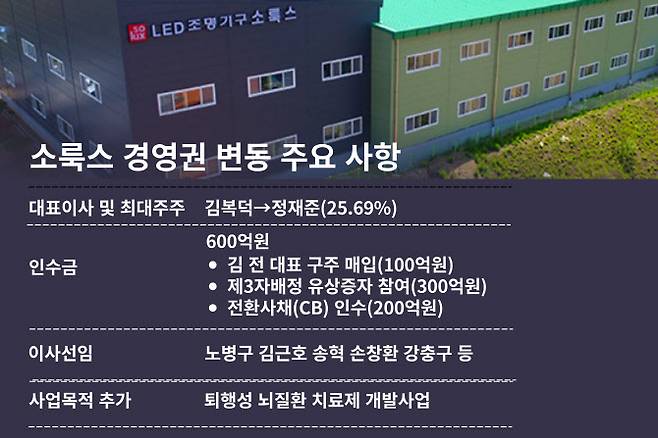 소룩스가 시장의 관심을 끈 시점은 지난 5월 중순부터였다. 소룩스 최대주주인 김복덕 대표가 정재준 아리바이오 대표와 300억원 규모의 경영권 및 주식매매 계약을 체결했다는 공시였다.