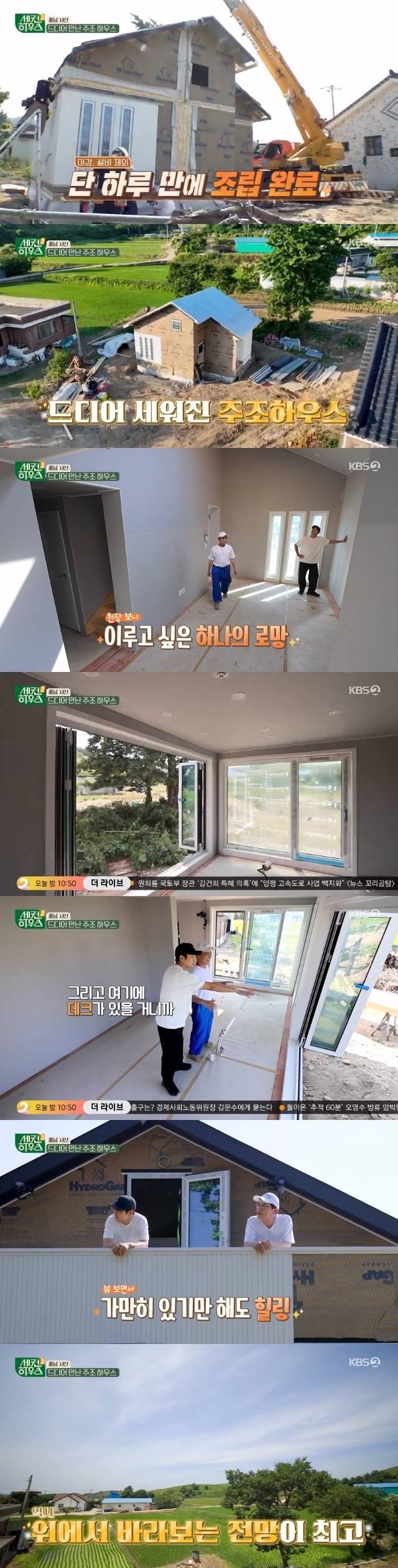 일주일 뒤 집은 단 하루 만에 조립 완료됐다. 층고 높은 거실에 바깥 풍경을 보며 요리할 수 있는 주방. 2층으로 올라가는 길 위치한 다락방과 2층의 테라스 등. 두 사람은 "괜찮은데? 느낌 너무 좋다. 잘 만들었다. 2층 올라오니 뷰가 예술이다"라며 놀라움을 감추지 못했다. (사진=KBS 2TV '세컨 하우스2' 캡처)