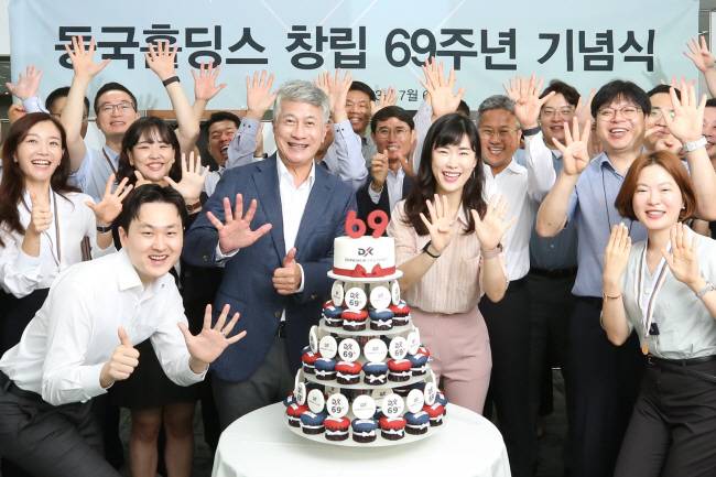 장세욱(맨 앞줄 왼쪽 두 번째) 동국홀딩스 부회장이 6일 서울 중구 페럼타워에서 열린 창립 69주년 행사에서 임직원들과 기념 촬영을 하고 있다.