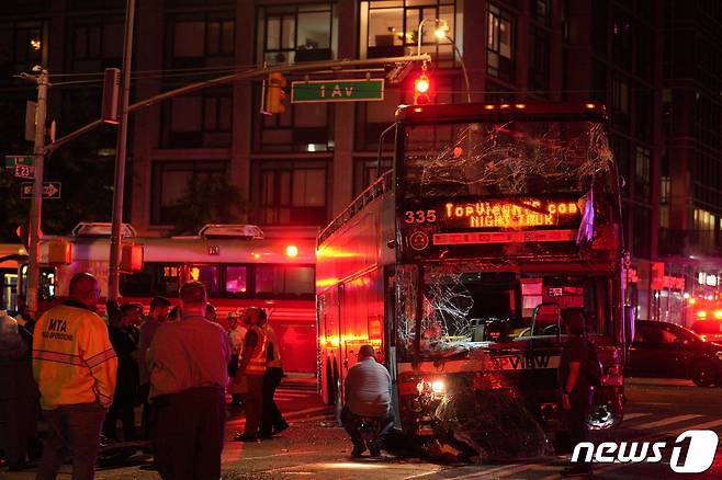 (뉴욕 로이터=뉴스1) 김민수 기자 = 미국 뉴욕시 맨해튼에서 이층짜리 관광 버스와 시내버스가 충돌했다. 2023.07.06/뉴스1