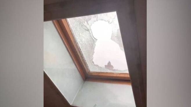 다락방 유리창이 깨지고 집안으로 우박이 쏟아져 들어옵니다.