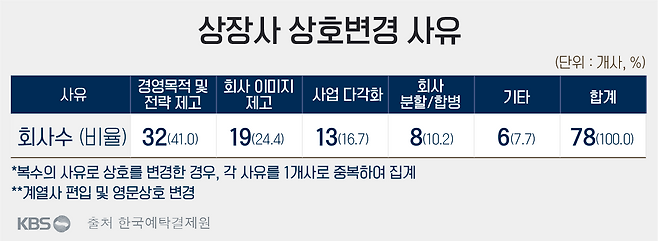 이름 바꾼 이유를 따져보면 '경영목적 및 전략 제고'가 32개 회사(41%)로 가장 많았습니다. 앞서 언급한 롯데웰푸드도 제과라는 사명이 지난해 7월 합병한 롯데푸드 상품들을 아우르지 못한다는 시각 때문에 탄생한 이름입니다. 또 대체단백질 제품으로 사업영역을 넓히고 영문을 넣어서 해외 시장까지 노린다는 포석도 있죠.