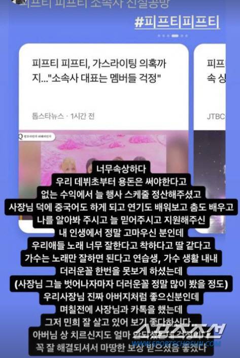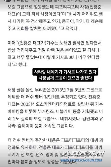 이어 "날 알아봐 주고 늘 믿어주고 지원해준 내 인생에서 정말 고마운 분"이라며 "우리 애들 노래 너무 잘한다고 착하다고 딸 같다고, 가수는 노래만 잘하면 된다고 연습생, 가수 생활 내내 더러운 꼴 한 번을 못 보게 하셨다"며 "우리 사장님 정말 아버지처럼 좋으신 분인데 며칠 전에 사장님과 카톡을 했는데 그저 민희 잘 살고 있어 보기 좋다 하신다"며 "아버님 상 치르신 지도 얼마 안 되셨는데 걱정이다. 꼭 잘 해결돼서 마땅한 보상 받으셨으면 좋겠다"고 강조했다.