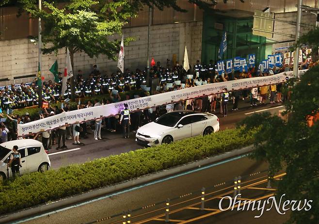 | ▲ 일본의 후쿠시마 원전 오염수 방류가 초읽기에 들어가자 8일 저녁 부산시 동구 부산역 광장에서 '부산시민 결사반대 7.8총궐기대회'를 마친 일부 참가자들이 일본영사관을 에워싸고 있다. |