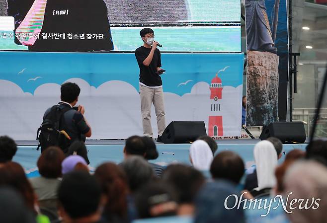 | ▲ 8일 저녁 '부산시민 결사반대 7.8총궐기대회'가 부산시 동구 부산역 광장에서 열린 가운데, 고등학교를 다니는 강태양(17) 학생이 무대에 올라 발언을 하고 있다. |