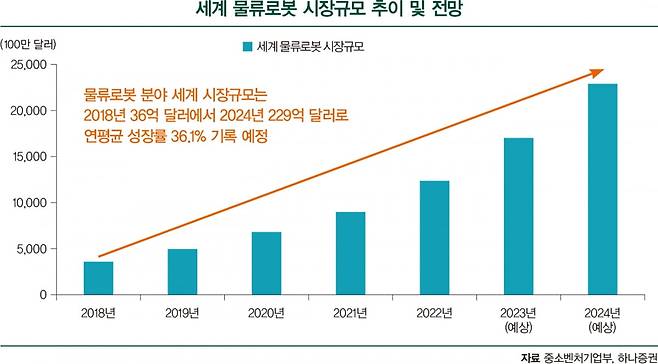 물류 로봇은 코로나19 사태 이후 전 세계적 인건비 상승 문제와 함께 대안으로 주목받고 있다. 물류뿐만 아니라 제조업 전반에 걸쳐 수요가 빠르게 늘고 있다. 물류 로봇은 크게 두 종류가 있다. 무인 운송 차량(AGV : Automated Guided Vehicle)과 자율 이동 로봇(AMR : Autonomous Mobile Robot)이다. AGV는 이동 경로가 정해진 물류 로봇이다. 주로 물류센터 등에서 쓴다. AMR은 자율 주행이 가능한 물류 로봇이다. 카메라나 라이다 등 센서를 이용해 사물을 인식하고 상황에 대처한다. 현재 AGV 대비 비싼 데다 운송 가능 무게가 낮다는 것이 단점이다. 중소벤처기업부에 따르면 2018년 36억 달러였던 글로벌 물류 로봇 시장 규모는 내년까지 229억 달러로 연평균 36.1% 성장세를 기록할 것으로 예상된다. 성장 기울기는 더욱 가팔라지고 있다.