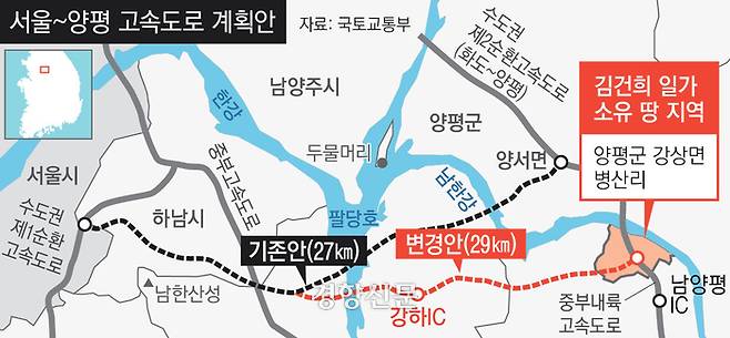 하지만 변경된 종점 예정지에서 중부내륙고속도로를 타고 1km 정도 아래로 내려가면 남양평 나들목이 있다. 김 여사 땅에서 고속도로 밑 굴다리를 지나 조금만 이동하면 남양평 나들목으로 중부내륙고속도로에 진입하고, 이내 서울-양평 고속도로로 갈아탈 수 있다. 이 정도면 종점에 나들목이 없더라도 서울로의 접근성이 월등히 좋아진다고 할 수 있다. 대상을 김 여사의 가족들로 확대하면 양평에 총 29개 필지(축구장 5개 크기)를 보유한 것으로 알려졌는데, 강상면에 20개 필지, 강상면에 이어진 양평읍에 9개 필지가 있어 혜택은 더 커질 수 있다. 다만 기존안대로 양서면에 종점이 생겨도 김 여사 일가 입장에선 정도의 차이가 있을 뿐 지금보다 서울 접근성이 크게 좋아지는 것은 마찬가지로 보인다.
