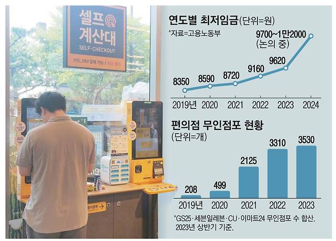 최저임금 인상 속도가 가팔라지며 인건비 부담이 커지자 편의점 등 자영업자들이 직원을 채용하는 대신 무인기계를 들여다 놓는 흐름이 강해지고 있다.