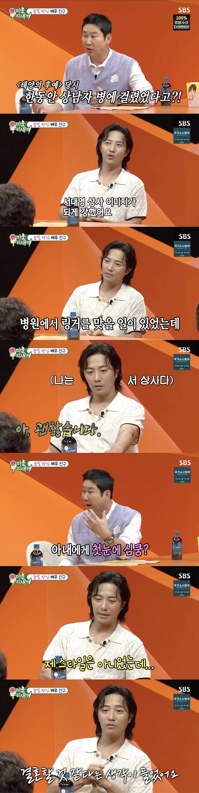 그리고 신동엽은 그가 드라마 '태양의 후예' 이후 상남자병에 걸렸다고 했다. 이에 진구는 "서대영 상사 이미지가 되게 강했다. 다들 서 상사로 알아주시니까 이미지를 깨뜨리기 어려웠다. 하루는 링거를 맞을 일 있어 병원에 갔는데 간호사분이 실수로 혈관을 터뜨렸다. 혈관이 막 부풀어 올랐는데 표정의 미동조차 보이면 안 될 거 같아서 괜찮다고 꾹 참았다"라고 말해 웃음을 자아냈다.