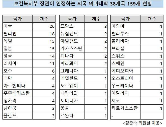 국회 보건복지위원회 정춘숙 의원실은 보건복지부와 한국보건의료인국가시험원에서 받은 '보건복지부 장관이 인정하는 외국 의대 현황 자료' 및 '보건복지부 인정 외국의대 졸업자의 국내 의사 국시 응시 현황(2019∼2023년)' 자료를 10일 공개했다. 이에 따르면, 올해 6월 현재 복지부 장관이 인정한 외국 의대가 가장 많은 국가는 미국으로 26개 의대에 달했다.
