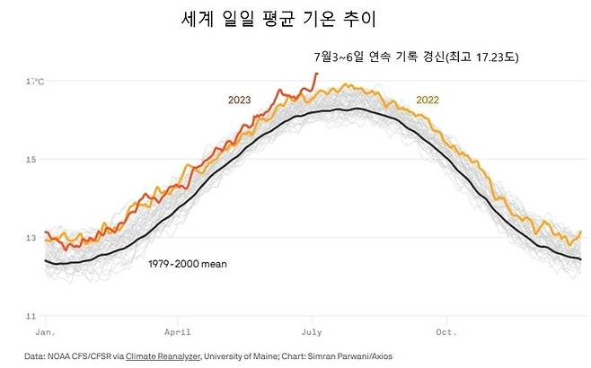 이달 들어선 일일 기온 기록까지 연일 갈아치우고 있다. 세계 일일 평균 기온은 지난 3일 17.01도로 엘니뇨가 극심했던 2016년 8월의 16.9도를 뛰어넘은 데 이어 4일과 5일 17.18도, 6일엔 17.23도까지 치솟으며 4일 연속 신기록 행진을 이어갔다. 7일과 8일엔 17.20도, 17.17도로 약간 꺾였지만 여전히 최고 수준을 유지하고 있다.