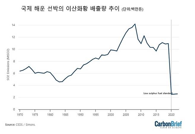 이는 국제해사기구(IMO)가 2020년 1월 선박유의 황산화물 함유량 상한선을 3.5%에서 0.5%로 대폭 낮춘 데 따른 것이다. 선박유로 많이 쓰는 중유, 특히 벙커C유에는 자동차 연료로 쓰이는 가솔린보다 황산화물이 1천배 이상 많이 들어 있다. 기후변화 전문 미디어 <카본 브리프>는 이번 조처로 인해 선박에서 배출되는 이산화황은 2020년 이후 연간 850만톤에서 250만톤으로 70%나 급감했으며, 이에 따라 전체 이산화황 배출량도 약 10% 감소했을 것으로 추정했다.