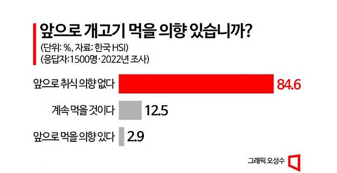 개 식용에 대한 찬반양론이 대립하는 가운데 사회적 분위기는 명백히 ‘반대’로 기울고 있다. 동물보호단체 한국 휴메인 소사이어티 인터내셔널(한국 HSI)이 지난해 시장조사 기관 닐슨코리아에 의뢰해 전 국민 1500명을 대상으로 실시한 ‘한국의 개고기 소비와 인식 현황 조사’ 결과, "향후 개 식용을 하지 않겠다"는 답변은 85%에 달했다. 이 같은 조사 결과는 2000년 한국식품영양학회지에 실린 인식조사에서 응답자 1502명 중 83%가 개 식용을 찬성했던 것과 비교해 국민적 인식이 큰 폭으로 달라졌음을 시사한다.
