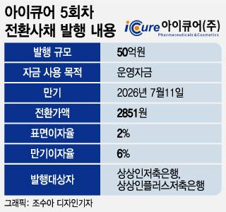 아이큐어가 50억원 규모 5회차 전환사채(CB)를 발행한다. 지난해 12월 343억원 규모 주주배정 유상증자 이후 약 7개월 만이다. 올해 들어 4회차 전환사채 사채권자의 풋옵션(조기상환청구권) 행사로 458억원을 상환하면서 추가적인 자금조달 수요가 발생한 것으로 풀이된다. 5회차 전환사채 발행 결정 뒤 주가가 급락하면서 주주들 시름이 깊어지고 있다.