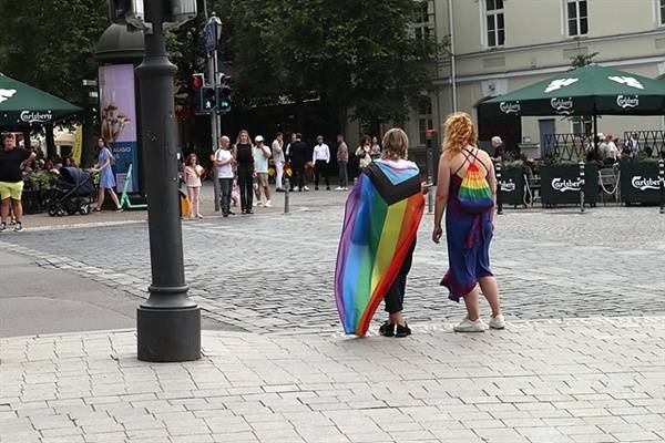 | ▲ 유럽 각국에는 성소수자를 지지하는 깃발이 걸려있다. 성소수자를 지지하는 깃발을 두른 여인이 횡단보도 앞에서 기다리고 있다. |