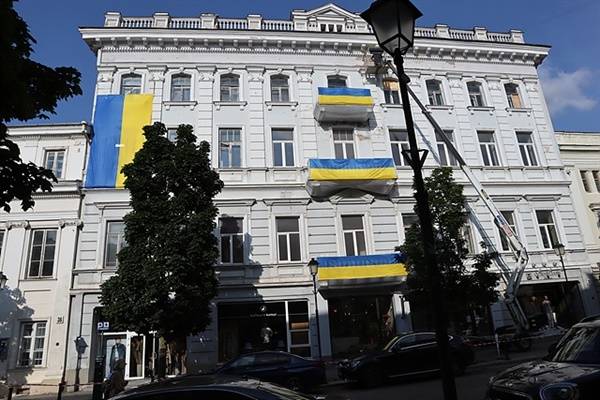 | ▲ 리투아니아 수도 빌뉴스 건물에 걸려있는 우크라이나 국기 모습. 우크라이나를 응원하는 깃발이다. |