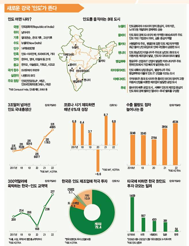 ‘인도’ 하면 한국인들이 흔히 떠올리는 생각이다. 카스트 제도와 힌두교 그리고 오염된 갠지스강 정도가 인도에 대한 이미지의 전부다. 각종 미디어에 노출된 모습과 인도를 다녀온 경험자들의 경험담이 더해지며 누적된 결과다. 이는 인도의 ‘일부’만 바라본 것이다. 우리가 알던 가난하고 더러운 인도의 모습은 점차 사라지고 있다. 2000년대 초반 급성장했던 중국처럼 인도 경제는 가파르게 성장 중이다. 경제성장률은 매년 6%대를 넘어선다. 전 세계에서 흘러들어오는 투자금을 활용, 사회 인프라, 산업 기반 시설을 꾸준히 늘린다.
