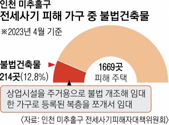 10일 전세사기피해자대책위원회에 따르면 인천 미추홀구에서 전세사기 피해자 중 복층 불법 개조 사례는 최소 26가구로 집계됐다. 피해액은 약 13억원이다. 상업 시설을 주거용으로 불법 개조해 임대한 사례까지 포함하면 불법건축물 피해 가구는 214가구에 이른다. 인천 전세사기 피해 가구 1669가구 중 12.8%에 해당한다.