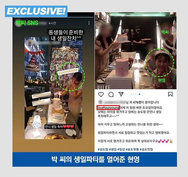 B씨는 현영과 함께한 생일파티 사진도 올렸다. "동생들이 준비한 생일잔치"라고 자랑했다. 현영도 인스타그램에 "송도맘 큰언니 생일을 축하한다. 서로 챙겨주고 위로하자"고 적었다.