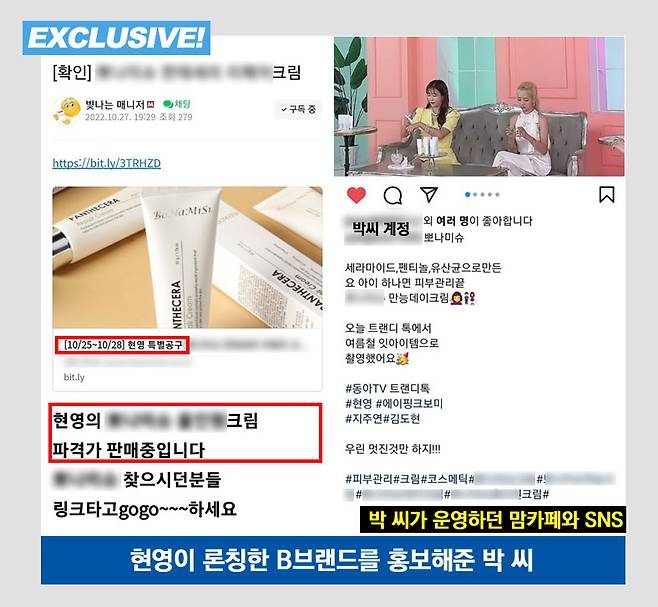 심지어 현영의 화장품을 맘카페에서 팔았다. '현영의 XX크림 파격가 판매'라는 게시글을 올렸다. 특별 공구 구매 좌표까지 찍었다. 개인 인스타그램에도 현영의 화장품 론칭을 적극 홍보했다.