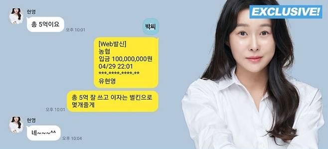 '디스패치'는 현영과 B씨의 카톡 대화를 입수했다. 현영은 지난해 4월 29일 오후 9시 54분, 1억 원씩 3차례를 송금했다. 또 같은 날 오후 10시 각각 1억 원씩 2억 원, 총 5억 원을 보냈다.