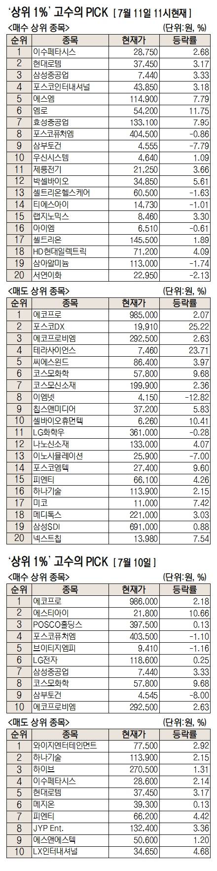 이날 미래에셋엠클럽에 따르면 미래에셋증권 주식 거래 고객 중 최근 1개월 간 투자수익률 상위 1%에 해당하는 ‘주식 초고수’들이 오전 11시까지 가장 많이 사들인 종목은 이수페타시스로 집계됐다.