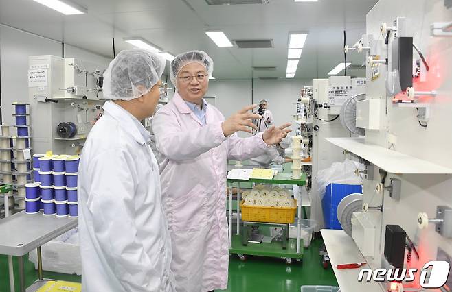 (서울=뉴스1) = 방기선 기획재정부 차관이 11일 오전 충북 청주시 메타바이오메드 의료기기업체를 시찰하고 있다. (기획재정부 제공) 2023.7.11/뉴스1