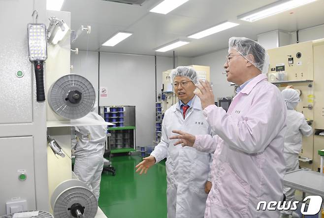 (서울=뉴스1) = 방기선 기획재정부 차관이 11일 오전 충북 청주시 메타바이오메드 의료기기업체를 시찰하고 있다. (기획재정부 제공) 2023.7.11/뉴스1