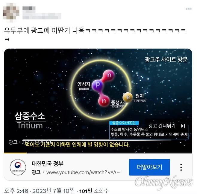 한 누리꾼은 10일 우리 정부가 유튜브에 후쿠시마 원전 오염수의 안전성을 홍보하는 광고를 하고 있다는 비판하는 글을 트위터에 올렸다. 11일 오후 3시 현재 이 글 조회수는 100만을 넘었다(https://url.kr/nva3jl).