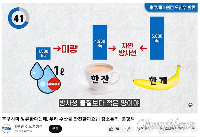 | ▲ 우리 정부 유튜브 채널 가운데 하니인 ‘대한민국 오늘정책’에서도 ‘김소통의 1분정책 : 후쿠시마 방류한다는데, 우리 수산물 안전할까요?’라는 제목의 영상에서도 후쿠시마 오염수에 포함된 삼중수소의 안전성을 홍보하고 있다. |