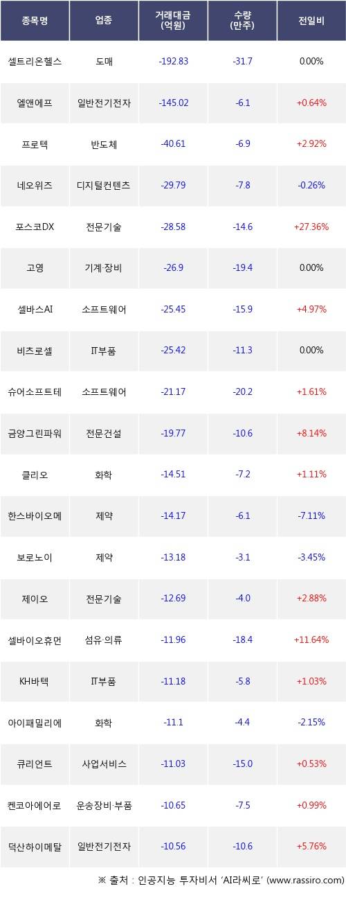 기관 투자자의 순매도 상위 20개 종목은 셀트리온헬스케어, 엘앤에프, 프로텍, 네오위즈, 포스코DX, 고영, 셀바스AI, 비츠로셀, 슈어소프트테크, 금양그린파워등이다.