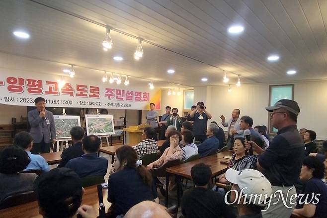 양평군은 11일 오후 3시 양서면 주민들을 대상으로 첫 주민설명회를 열었다. 폭우 중에도 주민설명회 장소(증동리 대아교회)에 모인 주민 70여 명은 한목소리로 "여야가 싸울 게 아니라 모두가 힘을 합쳐 (국토교통부에) 압력을 넣으라"고 강조했다.